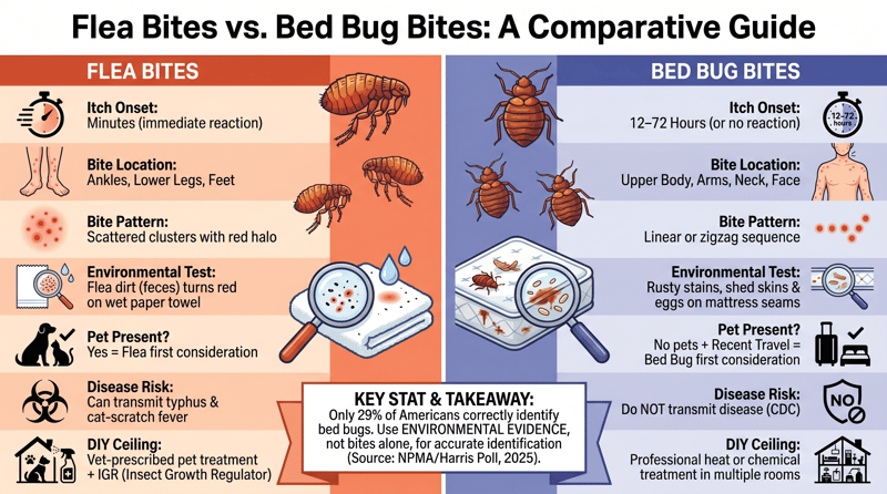 A quick rule of thumb: bites below the knee = flea first; bites on the upper body after sleeping = bed bug first.