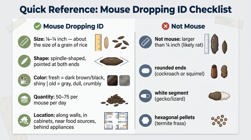 - ✗ Not mouse: larger than ¼ inch (likely rat), rounded ends (cockroach or squirrel), white segment (gecko/lizard), hexagonal pellets (termite frass)