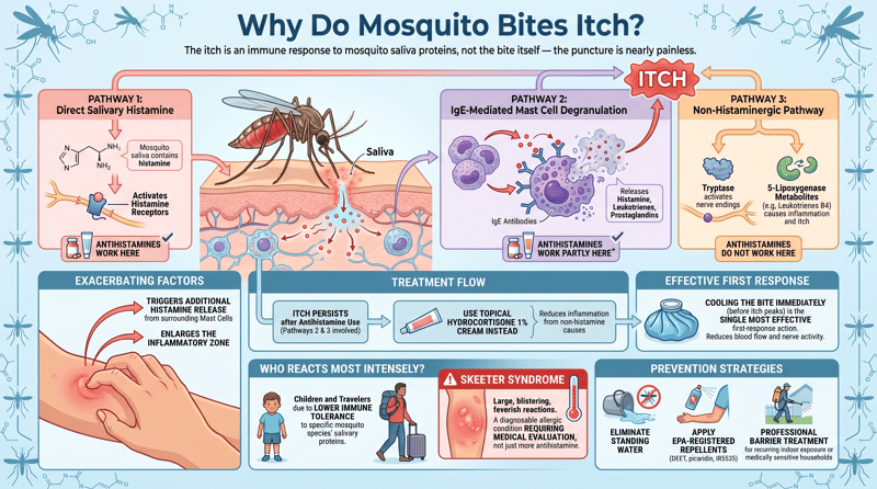 - Three biochemical pathways drive the itch: direct salivary histamine, IgE-mediated mast cell degranulation, and a non-histaminergic pathway involving tryptase and 5-lipoxygenase metabolites.